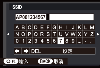 2. 输入网络名称(SSID)。输入完成后,高亮显示 设定 并按下 MENU/OK