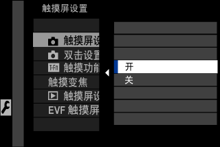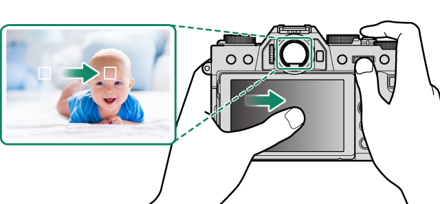 当在电子取景器(EVF)中构图时,LCD 显示屏可用于选择对焦区域。使用 D按钮/拨盘设置 > 触摸屏设置 > EVF 触摸屏区域设置 可选择用于触控控制的显示屏区域。