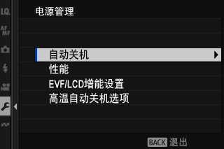 当 性能 选为 增强 时,调整 EVF 和 LCD 显示屏的设置。