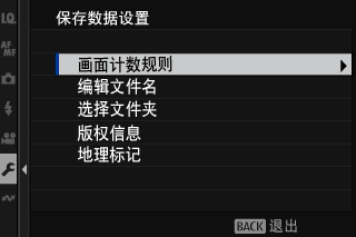 若要访问文件管理设定,请按下 MENU/OK,选择 D(设置)选项卡,并选择 保存数据设置。