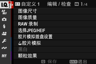 将胶片模拟指定给胶片模拟拨盘上的 FS1、FS2 和 FS3 或设置是否保存图像质量设置。