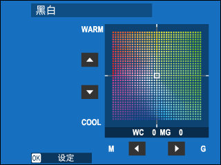 在使用 aACROS 和 b黑白 胶片模拟所拍的黑白照片中添加偏红或偏蓝色调(暖色氛围或冷色氛围)。您可在 WARM–COOL 和 G(绿色)–M(洋红色)轴上调整颜色。