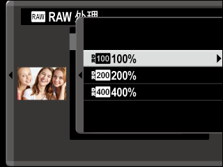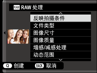 在回放过程中显示 RAW 照片时按下 Q 按钮也可显示 RAW 处理选项。