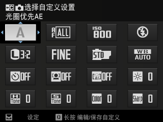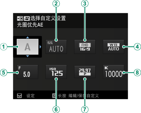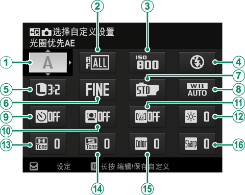 * 如果 F选择自定义设置 当前未选择设置库,则将显示拍摄模式。